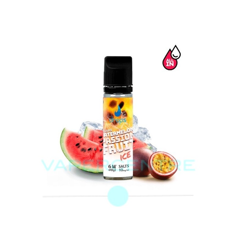 Drops All In Watermelon Passion Fruit Ice, este concentrado combina la jugosidad fresca de la sandía con el toque exótico y vibrante de la fruta de la pasión, creando una experiencia única para los amantes de los sabores frutales y exóticos, acompañado de el toque frío que le aporta el hielo.